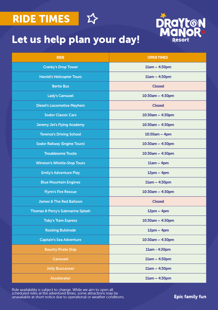 Planning a visit to Drayton Manor? Check this page for the latest ride availability and make the most of your fun-filled day!